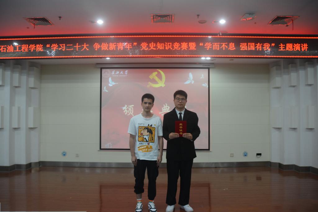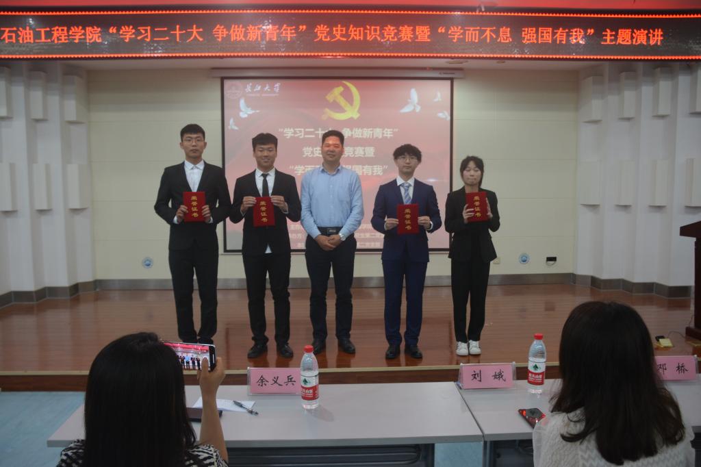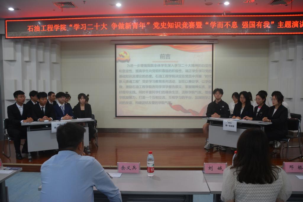 于图书馆报告厅顺利开展“学习二十大 争做新青年”党史知识竞赛暨“学而不息 强国有我”主题演讲活动。黄色a片党委副书记刘娥、油气井工程系教工党支部邓桥、余义兵,学工办史永波、郭冀宁、周晓峰、陈金建老师莅临本次比赛现场。