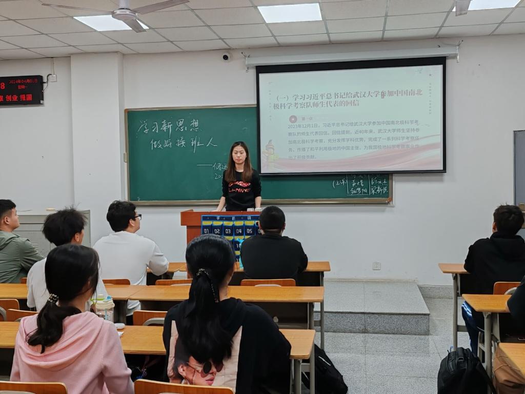 团委的领导下,各支部团支书带领支部成员集中学习了习近平总书记给武汉大学参加中国南北极科学考察队的师生代表回信精神。回信提到,近40年来,武汉大学师生坚持参加南北极科学考察,充分发挥学科优势,完成了一系列科学考察任务,传播了和平利用极地的中国主张,为我国极地科学考察事业作出了积极贡献。同学们纷纷表示要准确把握回信精神的精神实质和实践要求,向榜样们学习,在思想上、行动上、政治上自觉与党中央保持一致。